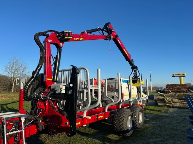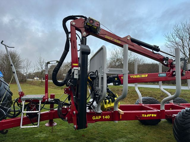 Tajfun Alsidigt og robust Prof skovvogn til effektivt skovbrug med 8,4 m kran. Inkluderet Udstyr & Specifikationer GAP 140: Drejeligt trækøje F150 Førerplatform til sænkbart led Platformsholder til Scanreco styring Hydraulisk lastearealforlængelse GAP 140 Aksler med hydrauliske bremser på 4 hjul -TLS Kran & Tilbehør: Kran DOT 55K 85 Underramme med støtteben 50/55K GAP EHC Danfoss med radio RC Scanreco LS rørforbindelse SÆT Danf, uden olie GAP Grab GO-026+GR463+BR10 med bremse Skovspil / Wire SÆT VD 15/VD 19 Radio Fjernbetjening Scanreco VD 15/19 Arbejdslys DOT 40/50/55K KPL. Ring for mere info på denne vogn