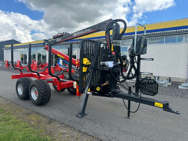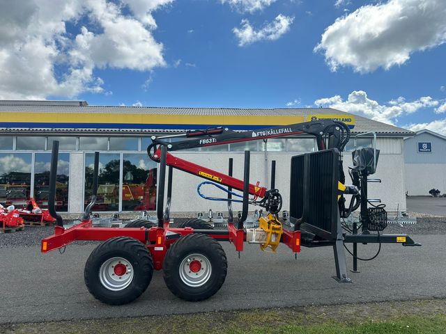 FTG FB 90 skovvogn med 4 bunker med 8 stokke, 400 traction hjul, bremser, ladforlænger med LED lys, motorsavs holder, ståplatform med krydsstyring, salngesamlinger på kran søjle og hy. støtteben. monteret med FB63TS skovkran som har en rækkevidde på 6,3 meter og et løftemoment på 47 kNm (brutto). teleskoparm med indvendig cylinder og 4-cylindret sving med 11 kNm svingmoment. Standardudstyr: 3-tons rotator, FB160 grab og pendulbremse. TS modellen har en netto løftekraft på 600kg på 6,3m.
