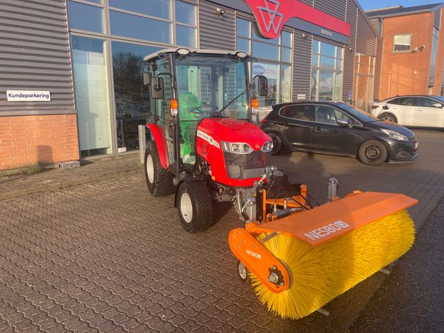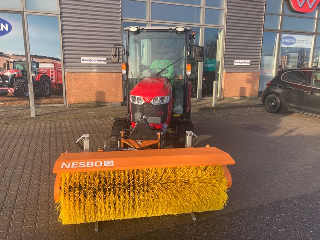 40 hk vandkølet 3 cyl. Dieselmotor Stage V • 36 liters brændstoftank 3 trins hydrostatisk transmission •1 pedals hydrostat med vendegear ved rat Justerbar aggressivitet aut. Gas funktion, Cruise control Kørehastighed max 30 km/t PTO Bag 540/540E med el-tilkobling i kabine samt på bagskærm Joy-stik til 2 x dobbeltvirkende midtmonterede ventiler Førerkabine med, varme, aircondition, LED arbejdslys, 2 stk. for og bag samt rotorblink og adv. Trekant. Radio, luksussæde med luftaffjedring, varme og justerbart ryglæn. El stik bla. 2 stk USB og telefon lomme, åbenbar side og bagrude El-varme i bagrude 3 punkts lift bag, 1200 kg løftekapacitet 7 polet el-stik og 2 stk. Dobbeltvirkende hydraulik udtag bag Standard trækbom Dækmontering: 24x8,50-12 for og 315/80-16 bag – græs mønster Mål: H 213 cm, B 130 cm • Vægt 1500 kg Frontlift og 1000 PTO(fra motor) samt Nesbo 1500P ny fejemaskine fra 2017