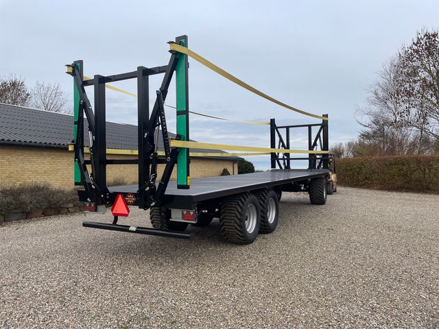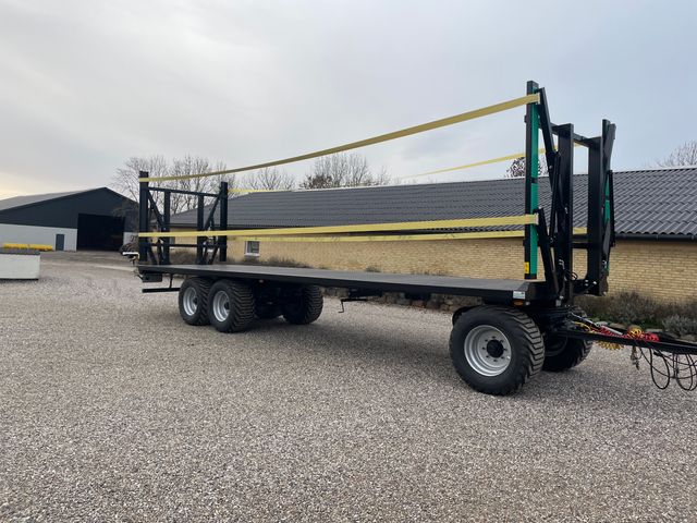 Fabriks nye Palmse halmvogne med 550/45-22,5 BKT hjul ,boggi , bremser og af fjedring på alle aksler sidemarkering lys og værktøjskasse Hydrauliske sider til sikre ballerne eller kartoffelkasser. En rigtig solid og stærkvogn der kan laste 20 tons. Den er produceret Palmse fabrikken der har mange års erfaring med vogne. Vognen kan levers i valgfri farve. Vi har mange forskellige modeler på lager