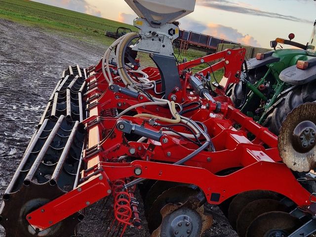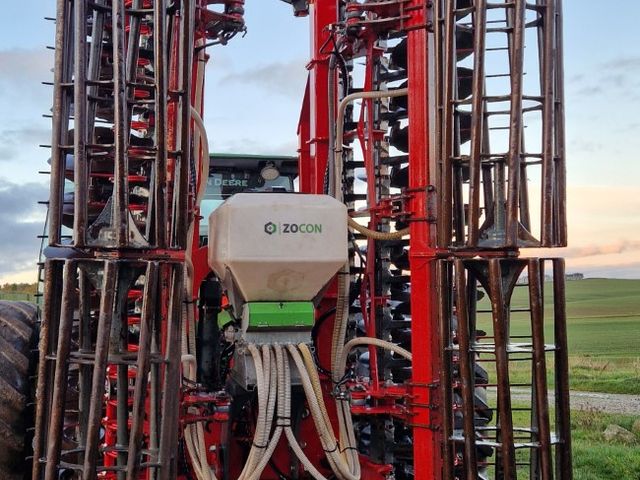 Rigtig fin og velholdt tallerkenharve lige klar til at køre i marken. Med ZOCON kørselsafhængig frøsåmaskine