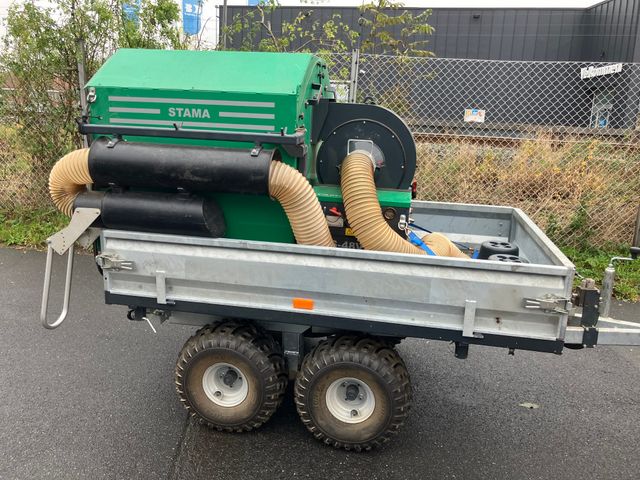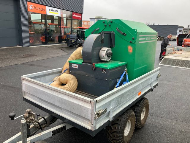 Stama ELS-B 48V løvsuger. Opbygget på K-Vogn boggie trailer med hydraulikstation og tip. Årgang 2021. Brugt meget lidt. Alle lade stik medfølger. Nypris 220.000,-
